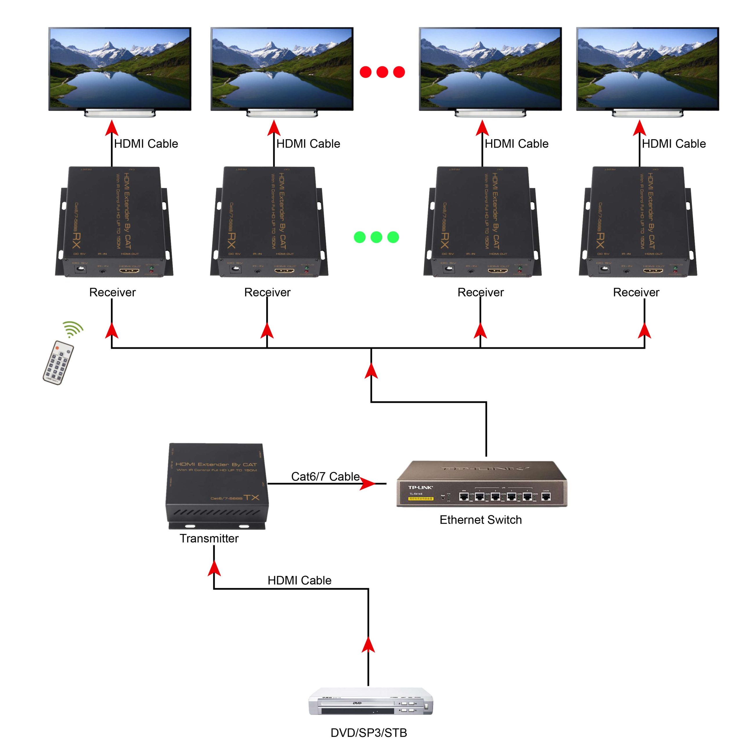 The extender uses one piece of standard CAT6/7 (cable length max up to 150M) to transmit the HD Signal from the DVD, HD Player, PC and other HD source set to the Display at distance; It follows the TCP/IP protocol to send the HD Video by the local area network; It supports one sender to multi receivers and Cascade connection way to transmit the HD Signal by the help of Ethernet switcher. Also it can return the received IR signal at the receiver to the sender to help the users to control the HD source at long distance.