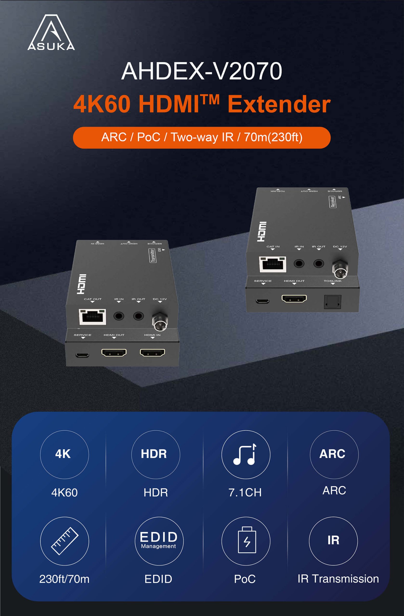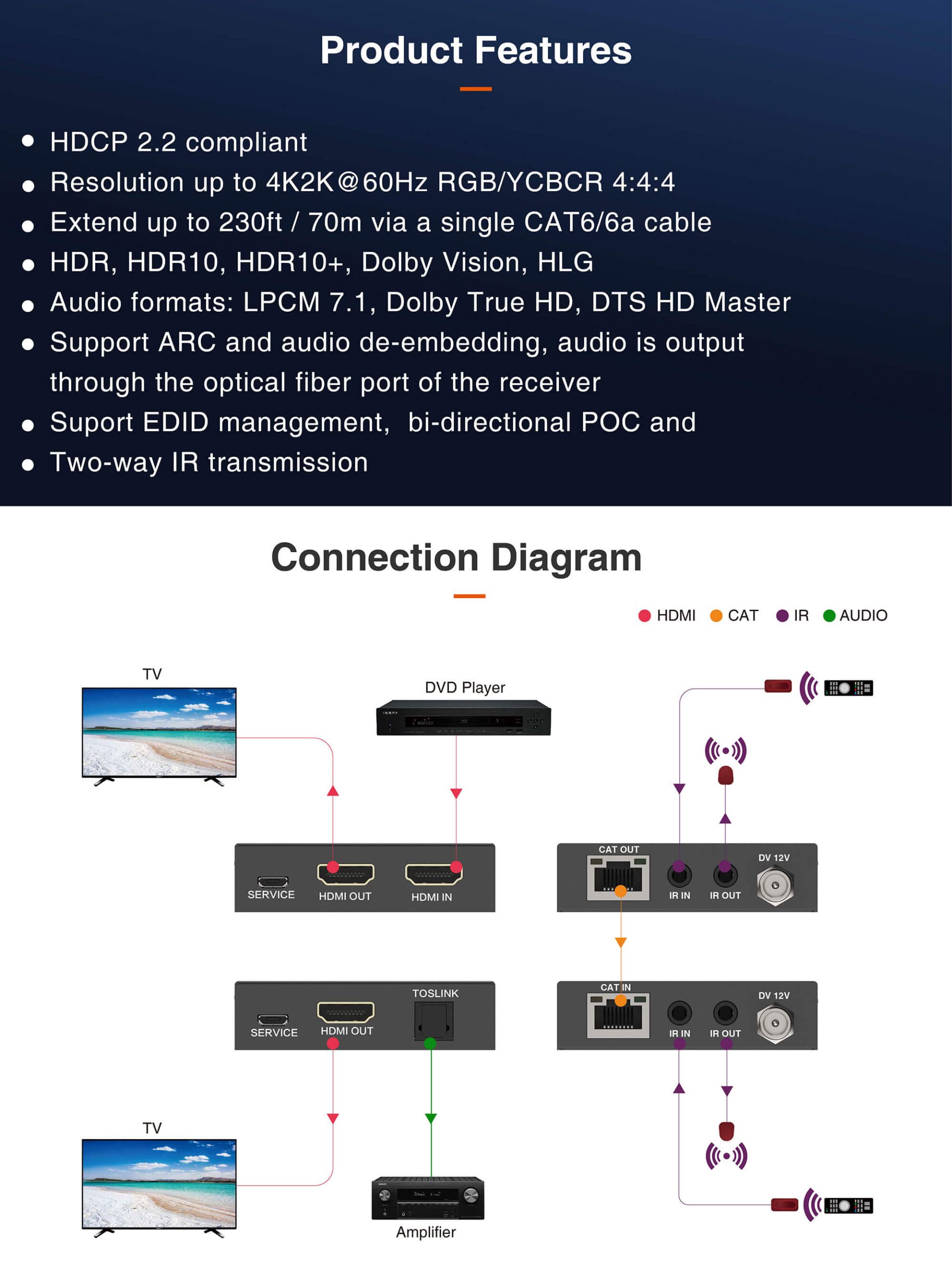 This 18Gbps HDMI Extender can extend HDMI HD signal and IR control signal to a distance up to 230ft / 70m via a single CAT6/6a cable, which can achieve zero-delay, uncompressed long-distance transmission be- tween the transmitter and receiver. Video resolution is up to 4K2K@60Hz. It supports EDID copy pass-through function between the source device and display device. It supports PoC function.