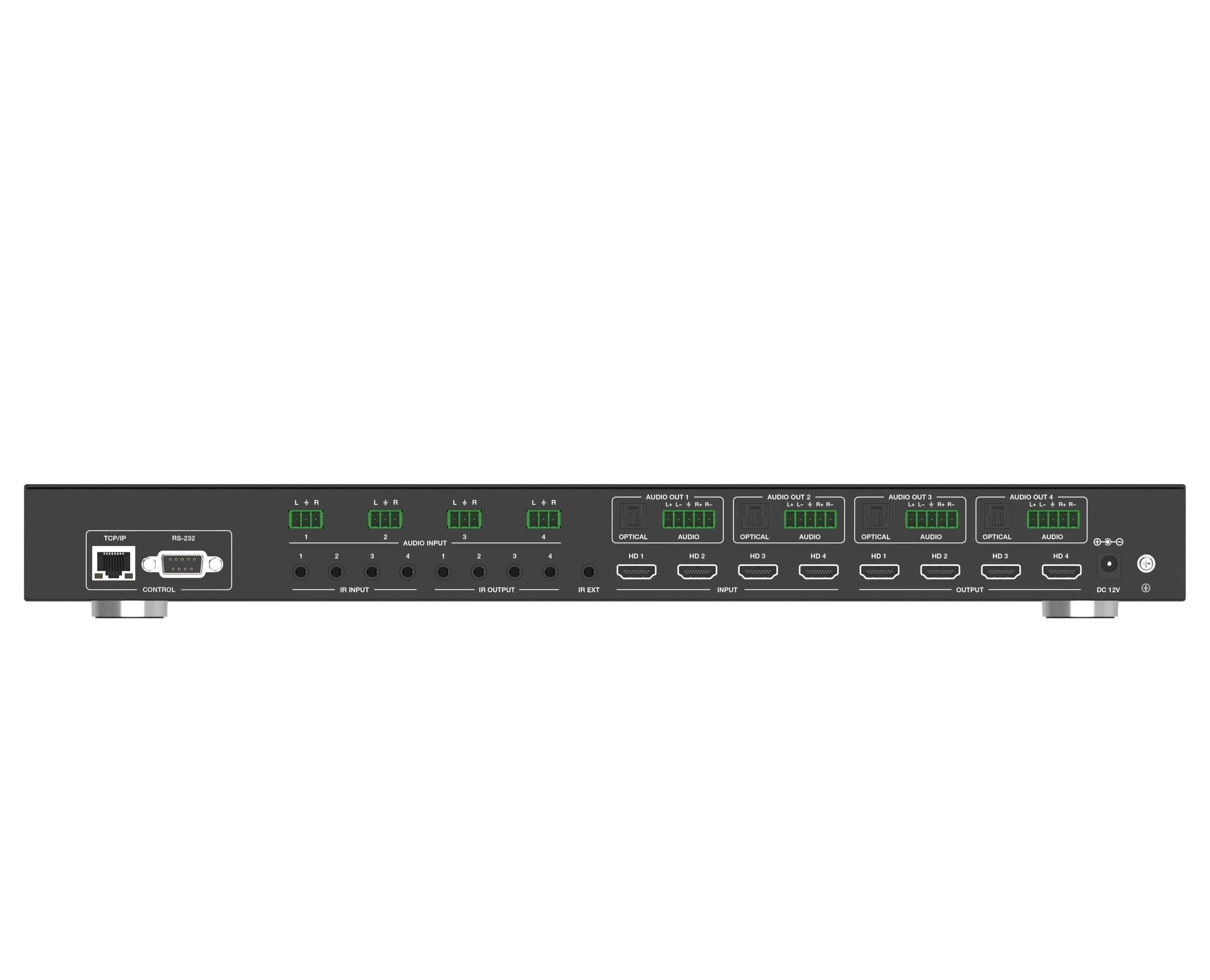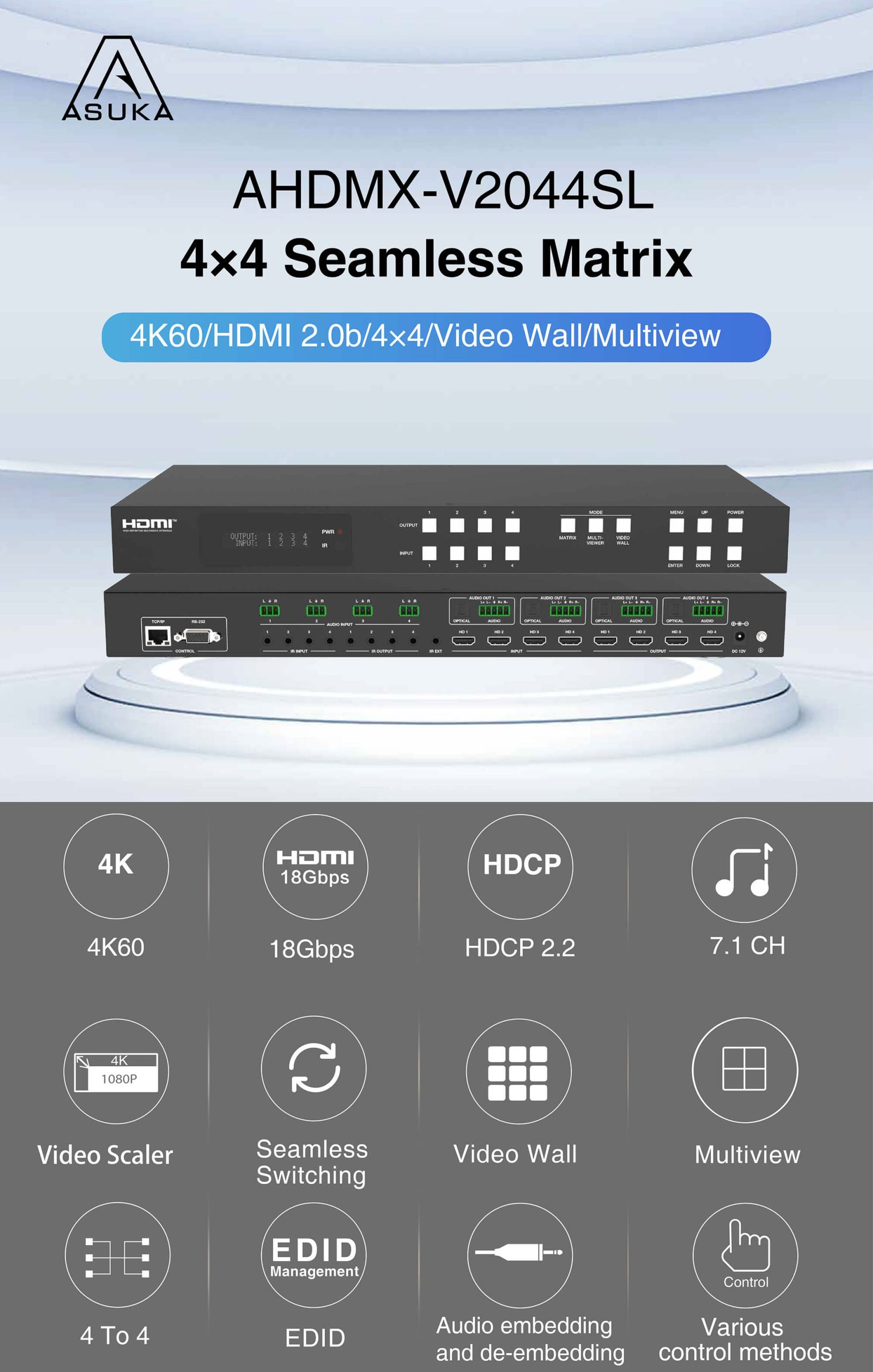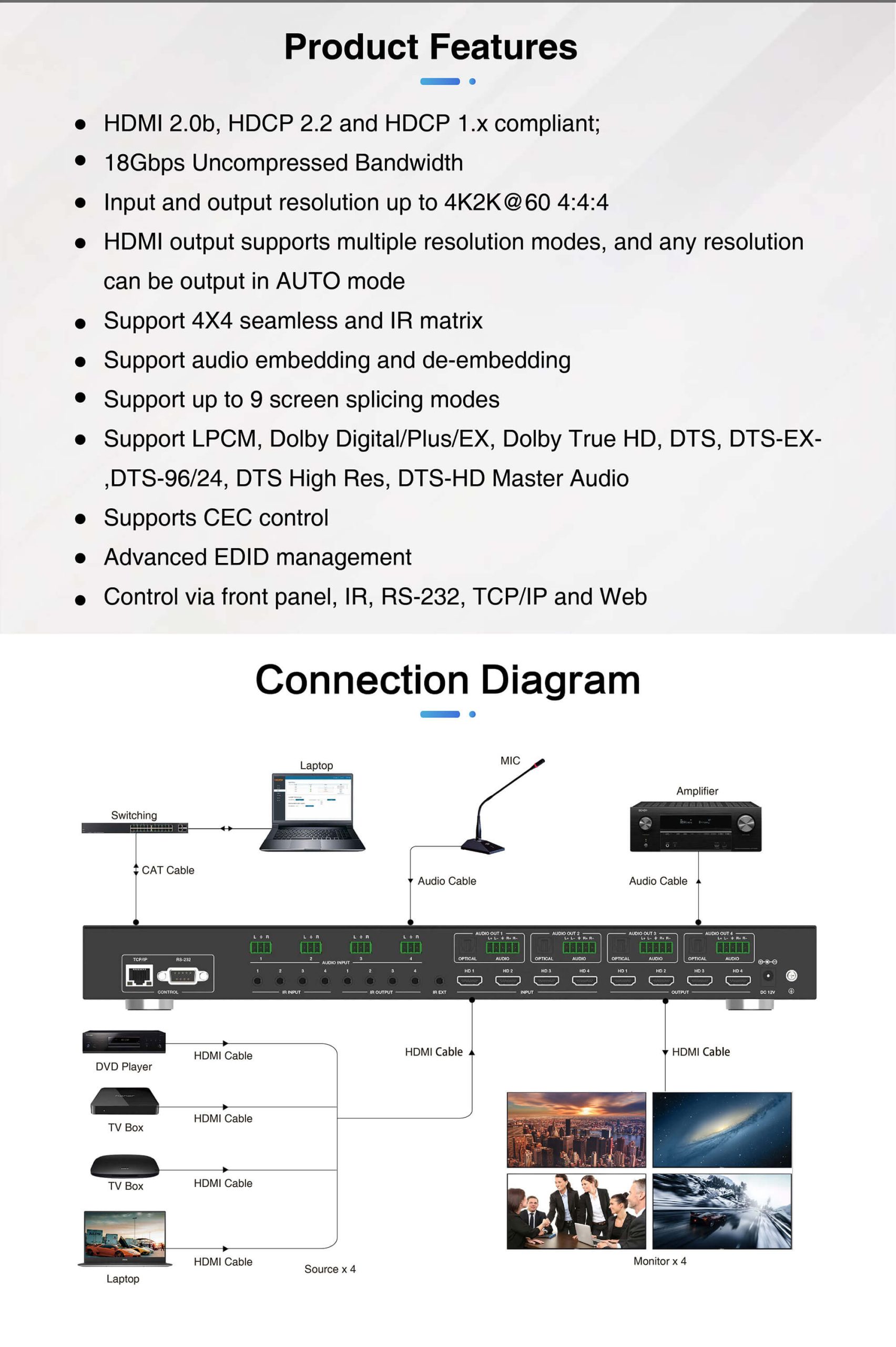 The 18Gbps 4×4 seamless UHD Matrix can connect 4 HDMI sources to 4 HDMI displays. Supported video resolution is up to 4K60 4:4:4. The product supports IR matrix and Audio matrix. IR matrix routing follows the video routing. Audio extract and insert are supported. The product supports CEC management and strong video wall processing.
