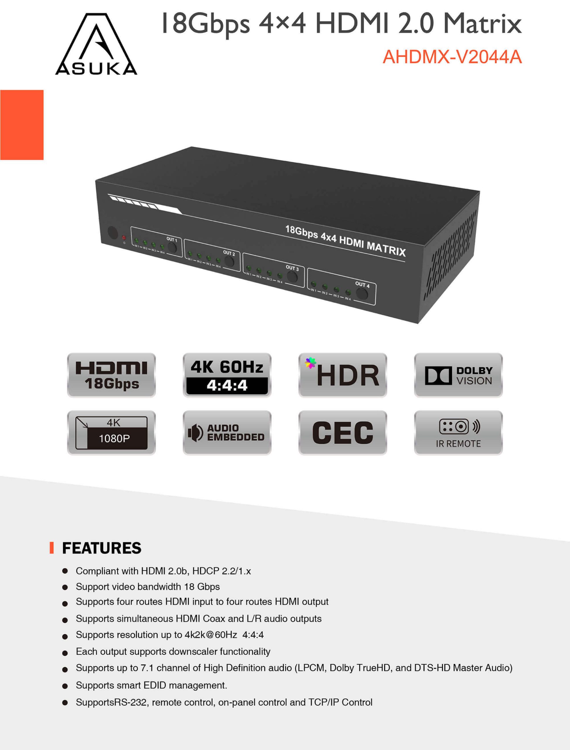 This high performance HDMI Matrix Switcher can switch any of these four HDMI 2.0 sources to four HDMI 2.0 displays. Each input and output supports up to 4K60 444 resolution and HDCP 2.2. The outputs can be individually scaled for 1080p. De-embedded audio as analog L/R and coaxial is available for both outputs. The ARC function can return display device audio to coaxial port output only. Advanced EDID management is supported. With its 18Gbps bandwidth and the additional features with latest HDMI standards. This switcher can be controlled from the front panel, RS-232, IR remote, or TCP/IP.