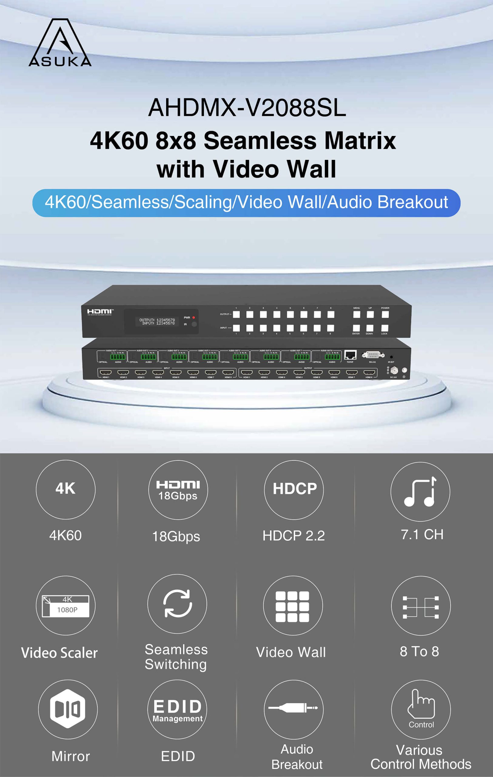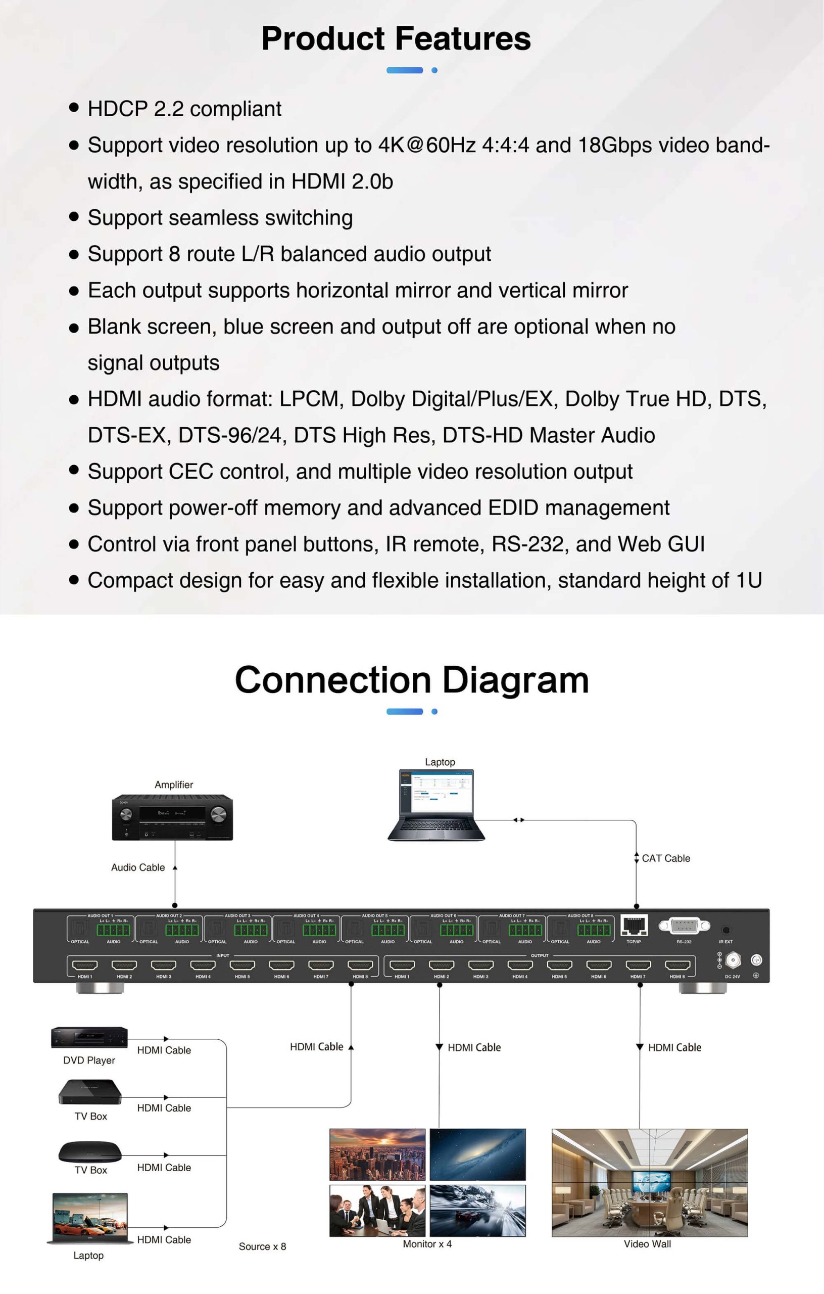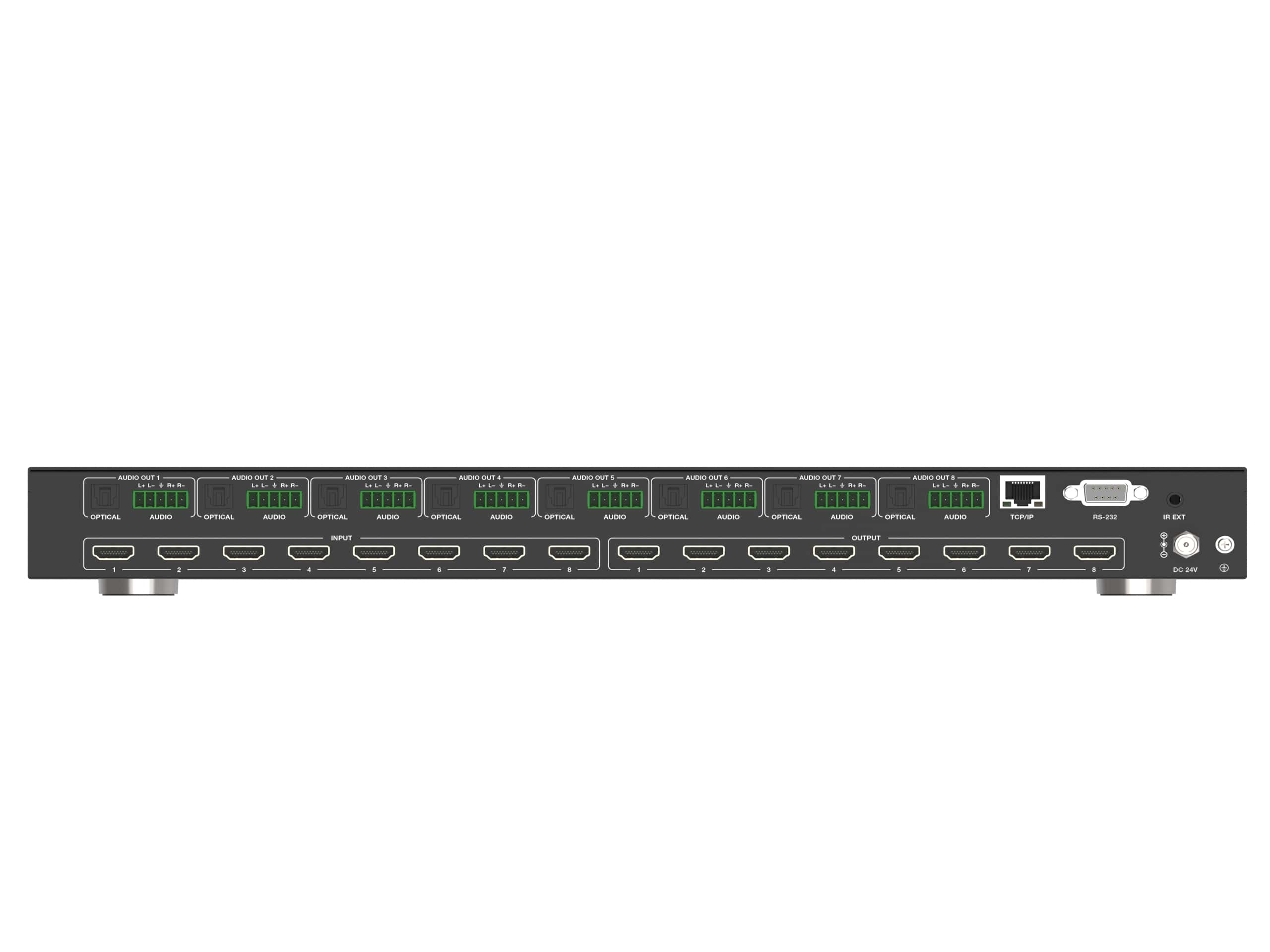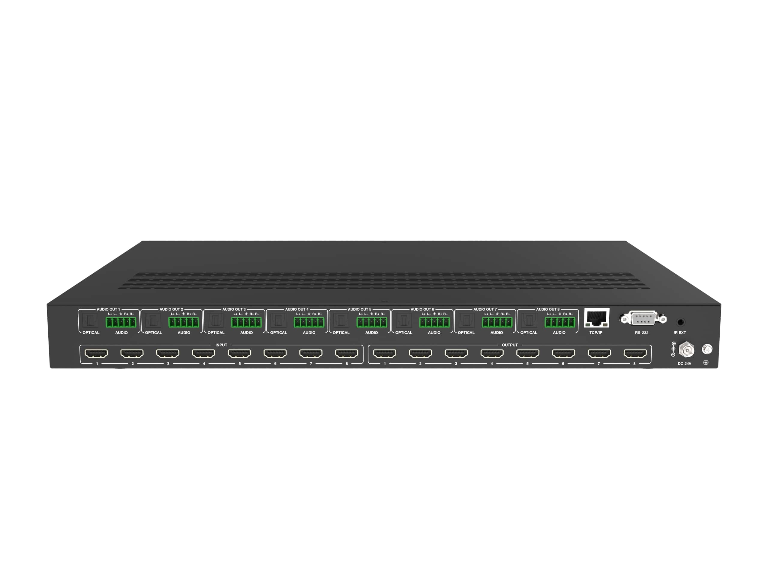 The 18Gbps 8×8 seamless UHD Matrix can connect 8 HDMI sources to 8 HDMI displays. Supported video resolution is up to 4K60 4:4:4. The product supports IR matrix, and IR matrix routing follows the video routing. Audio extract and insert are supported. The product supports one or more video wall with RS232 command.