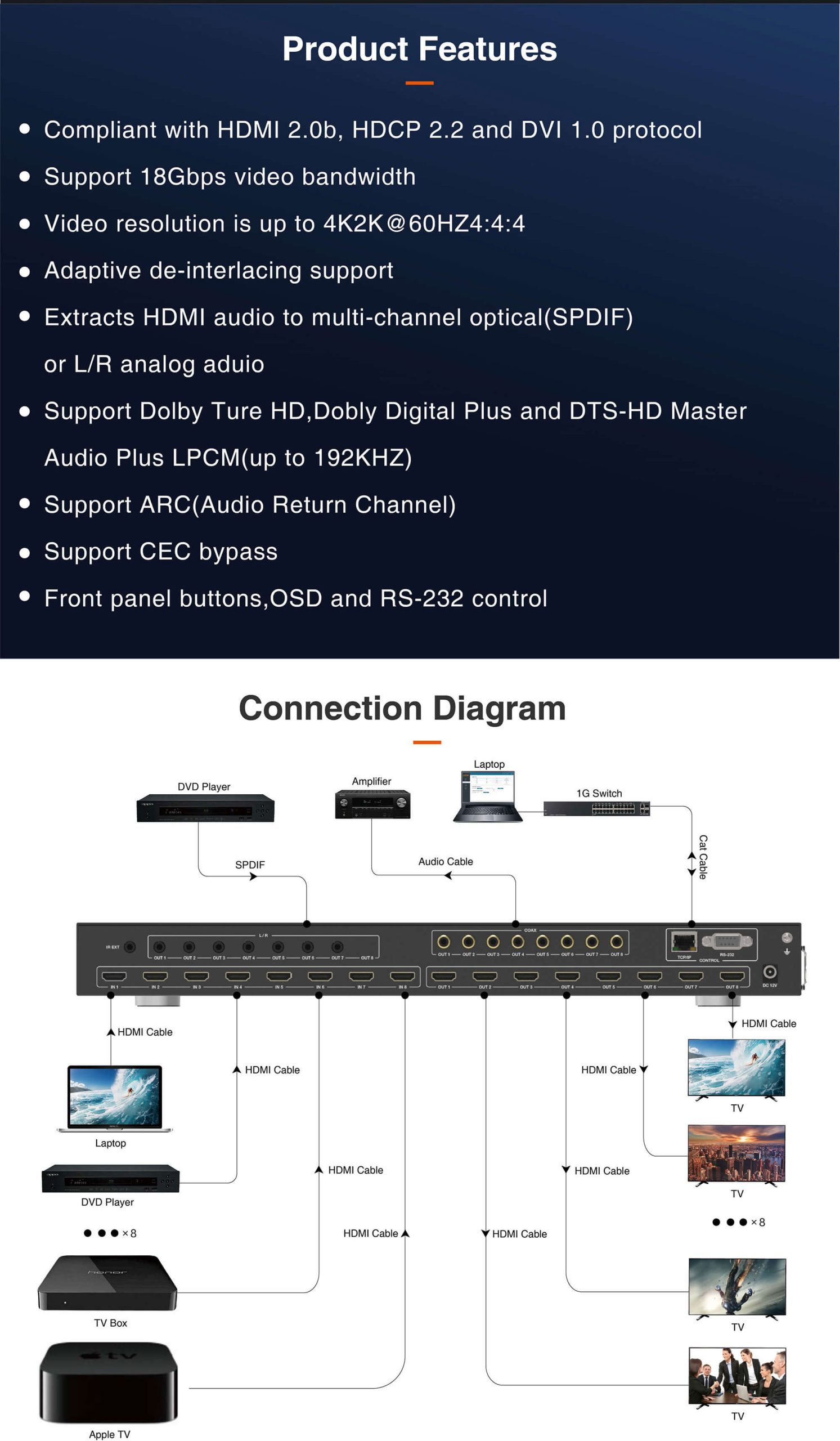 The 18Gbps 8×8 HDMI Matrix supports the transmission of video (up to 4K2K@60Hz YUV 4:4:4) and multi-channel high resolution digital audio from 8 HDMI sources to 8 HDMI displays. Audio de-embedded to analog and coaxial audio is supported from 8 HDMI output ports. While HDMI output ARC function is enabled, the ARC audio from HDMI display devices will be extracted to coaxial audio output. Each HDMI output of this 8×8 HDMI Matrix supports 4K2K to 1080P downscaler independently. Control is via front panel buttons, IR remote, RS-232, LAN and Web GUI.
