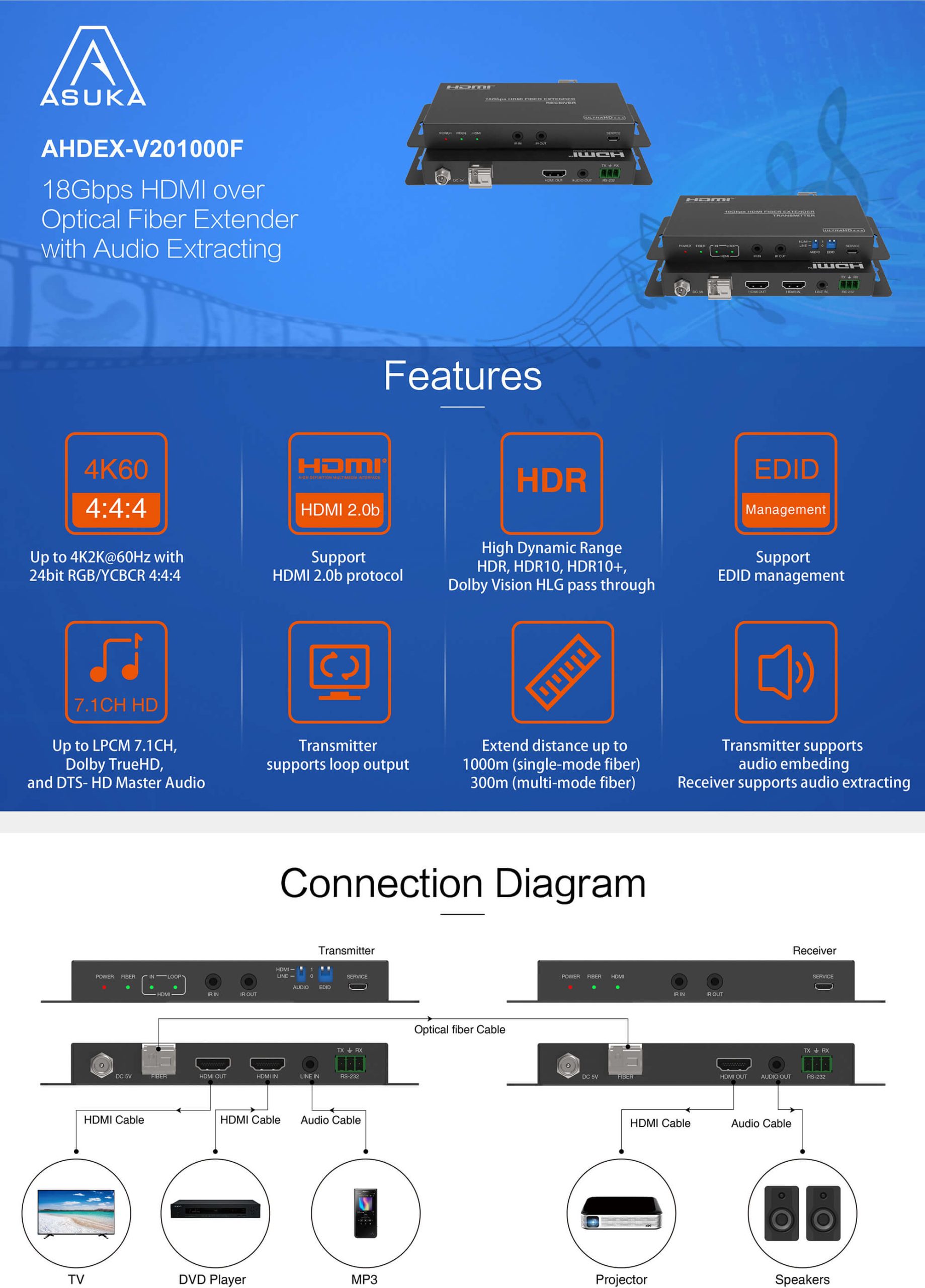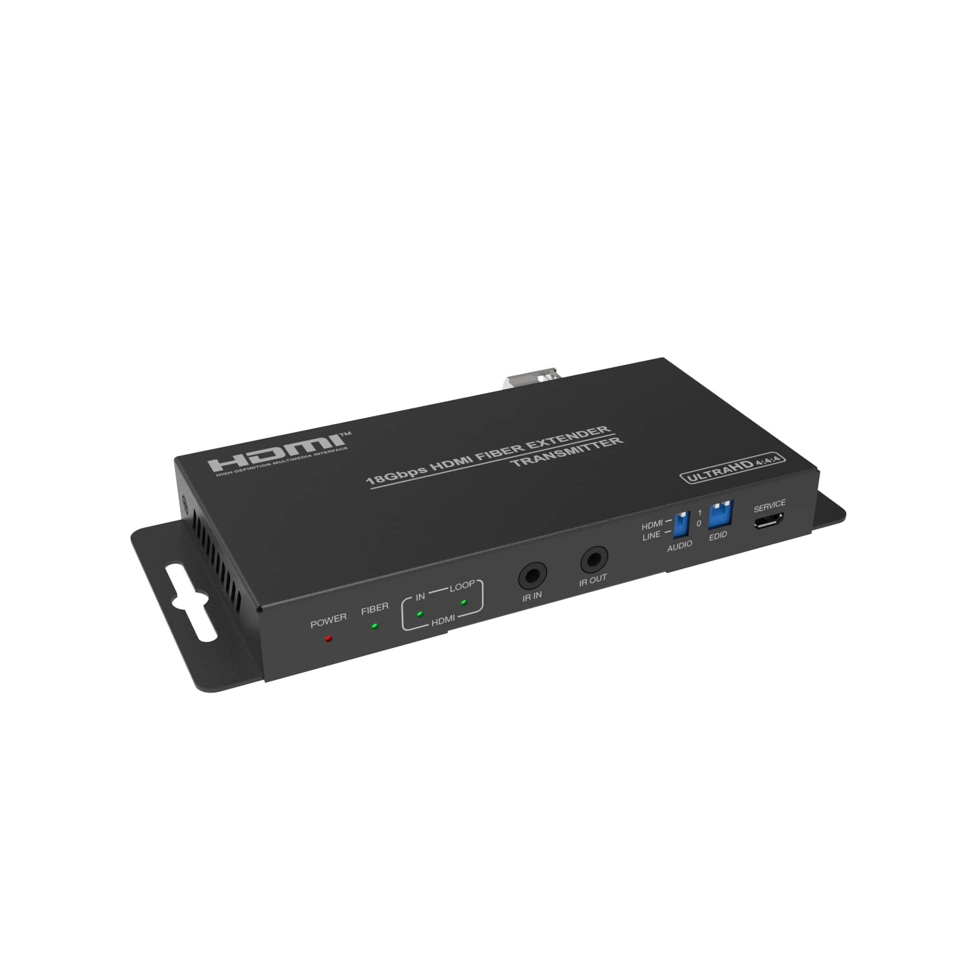 This HDMI Extender can extend HDMI signal up to 3300 feet/1000 meters (over single-mode fiber cable) or 1000 feet/300 meters (over multi-mode fiber cable). Video resolution is up to 4K2K@60Hz 4:4:4. Transmitter supports loop output, audio embedding and EDID management function. Receiver supports audio extracting function. In addition, the extender supports bidirectional IR control and RS-232 signal pass-through. It can allow you to easily control the display device on the signal source side or control the signal source device on the display side when using this extender.