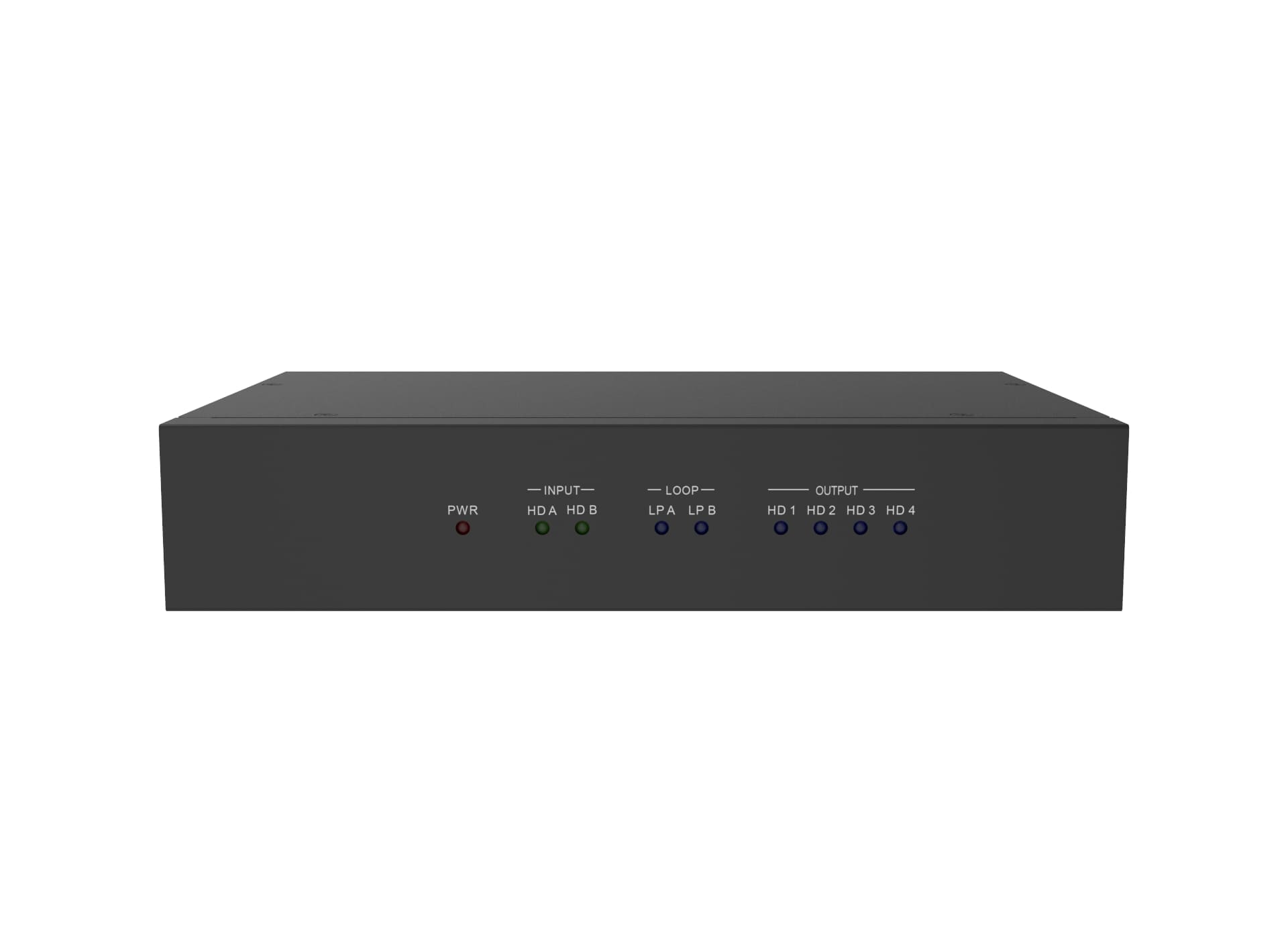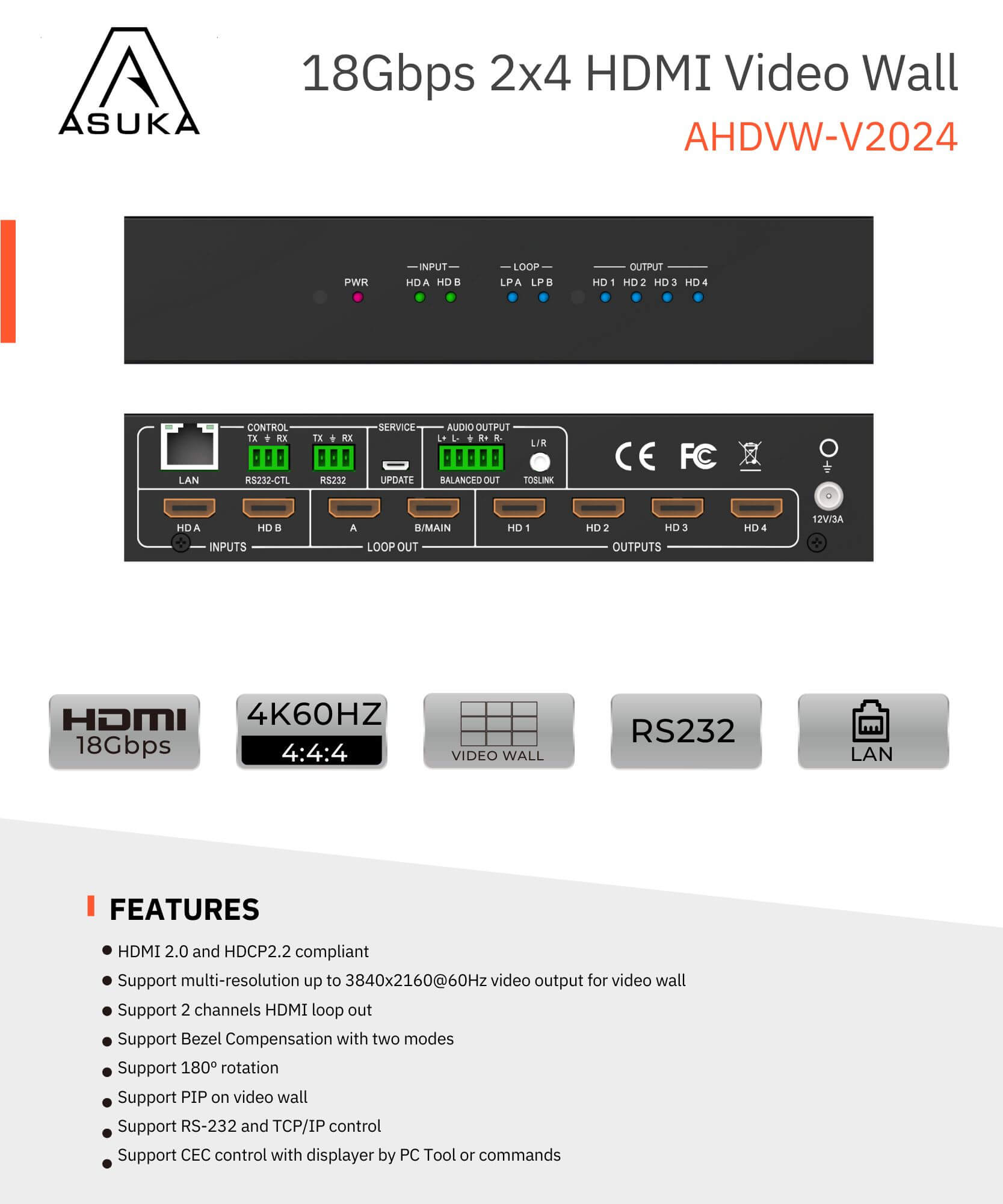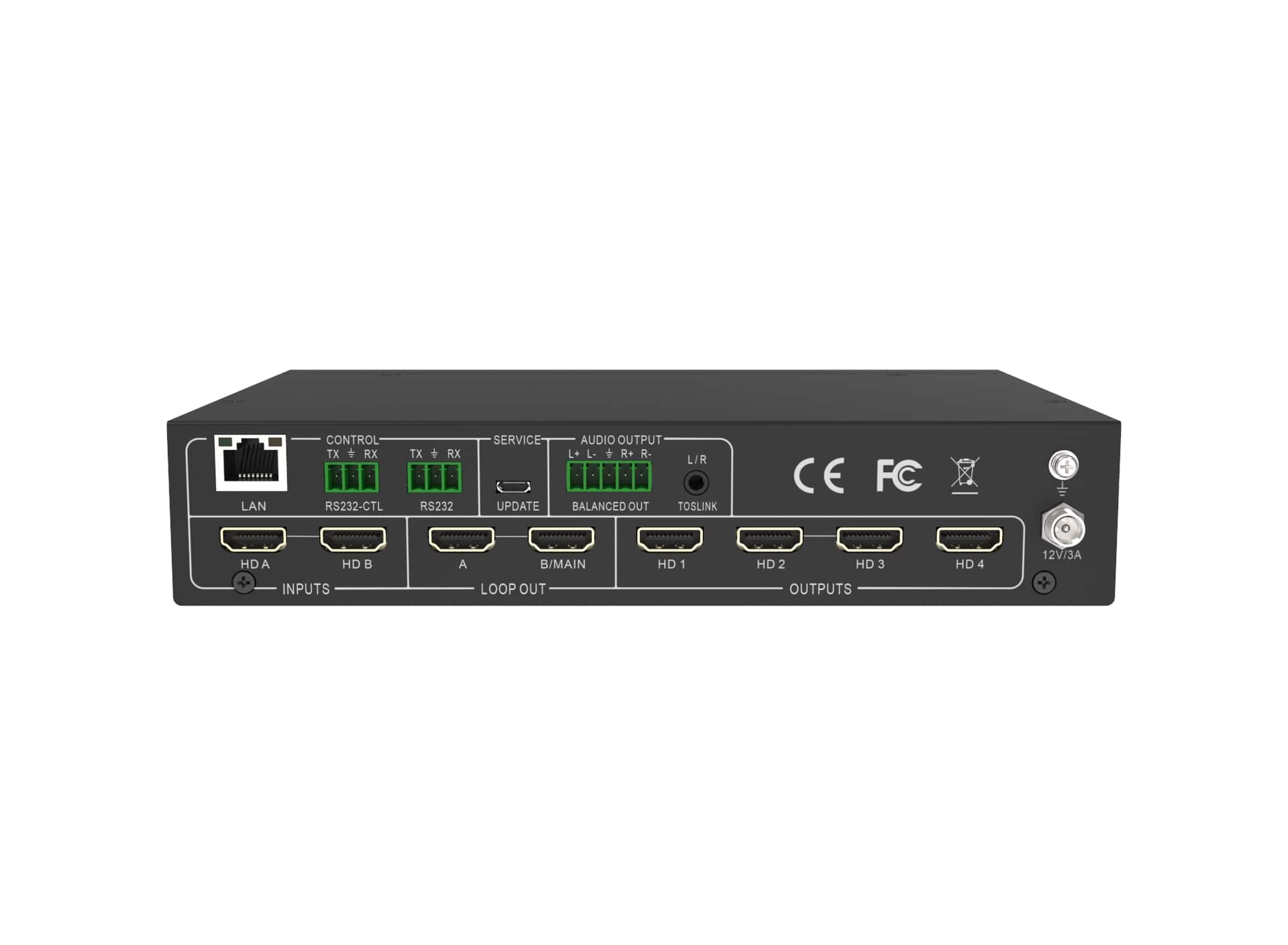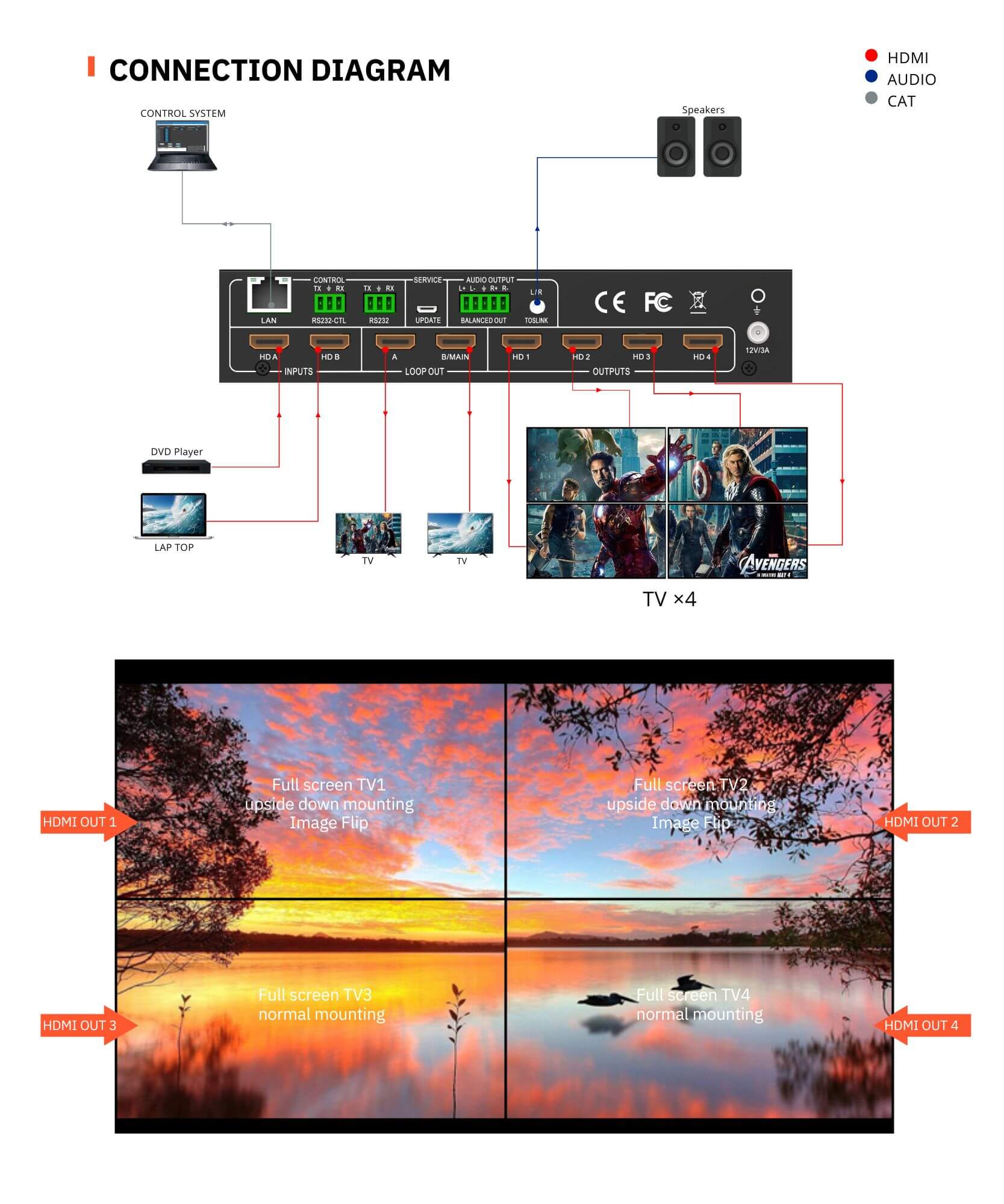 This product is a HDMI 2.0 Video Wall controller with 2 HDMI input, 2 HDMI loop out and 4 HDMI scaling out for video wall processing. The Toslink jack terminal provides analogue L/R audio and digital SPDIF audio output. 5-pin phoenix jacket provides balanced L/R audio output, with PC Tool or RS232 commands to control the product for different wall display.